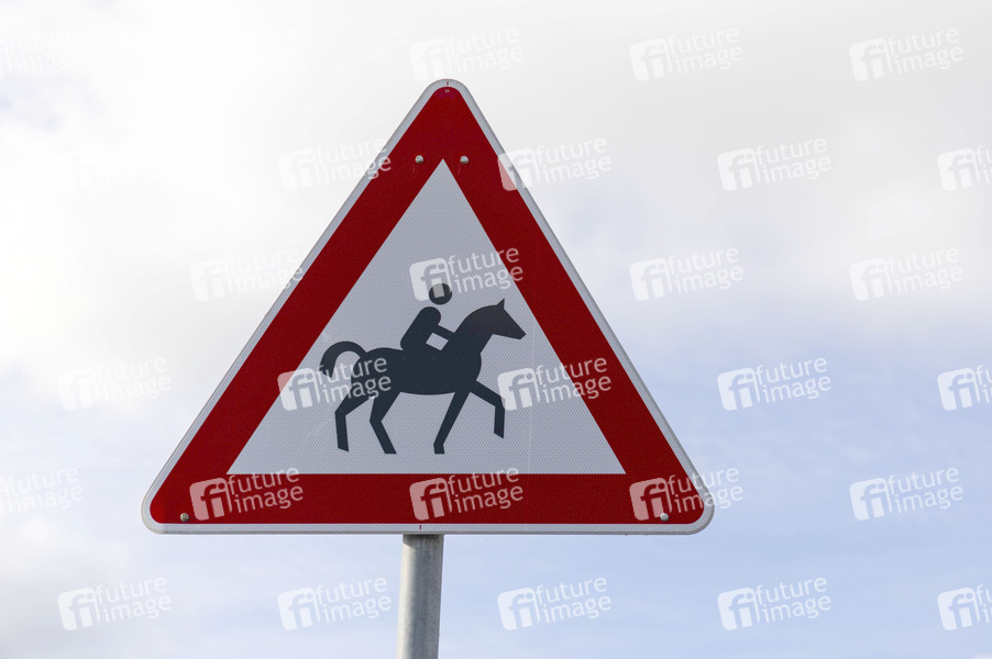 Verkehrsschild 101-13, Gefahrenzeichen, Verkehrszeichen, Schild, Dreieck, roter Rand, dreieckiges Schild, Warnschild, Warnung, Gefahr, Tier, Tiere, Pferd, Pferde, Reiter, Symbolbild, Themenbild