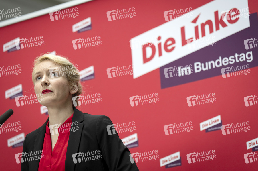 Ines Schwerdtner bei einem Pressestatement der Partei Die Linke im Reichstagsgebäude. Berlin, 12.03.2025