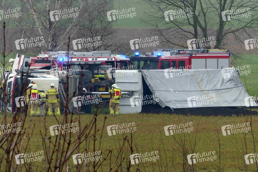 Ein Lastwagen ist beim Abladen von Erde auf einem Feld am Landwehrweg umgestürzt. Vermutlich ist der Wagen auf dem zu weichen Untergrund am Seitenstreifen eingesackt und umgekippt. Die Feuerwehr und Rettungswagen sind vor Ort. Eldagsen, 18.03.2021