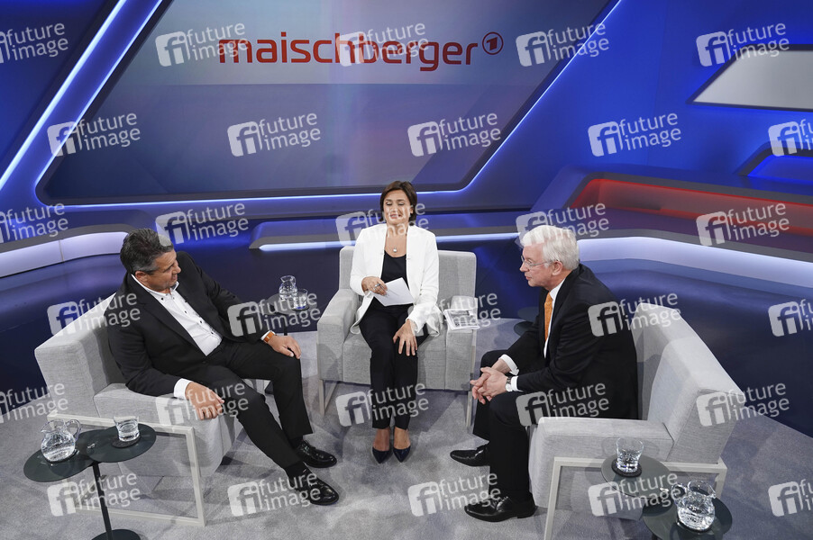 Sigmar Gabriel, Sandra Maischberger und Roland Koch in der ARD-Talkshow 'Maischberger' im WDR Studio BS 3. Köln, 08.05.2019