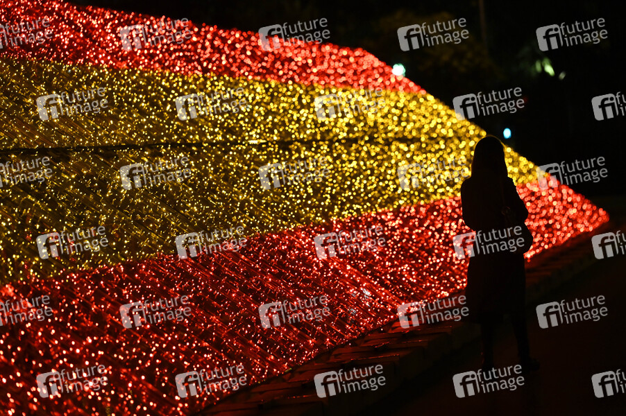 Spanische Flagge Installation auf der Plaza de Colon - Einschalten der traditionellen Weihnachtsbeleuchtung im Stadtzentrum. Madrid 26.11.2020