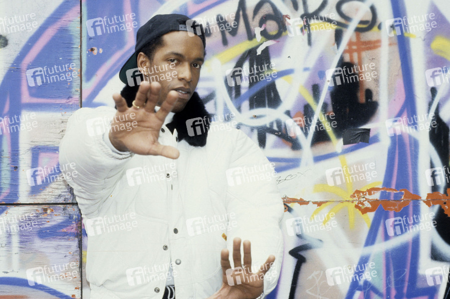 Derek B bei einem exklusiven Photoshooting vor einer Graffiti-Wand. London, 15.03.1990