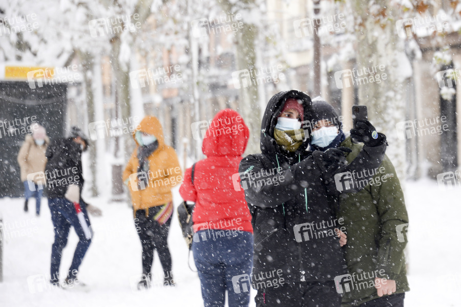 Das Sturmtief Filomena sorgt in der Region Madrid und anderen Teilen Spaniens mit starken Schneefällen für Chaos. Die Hauptstadt Madrid wurde durch historisch heftigen Schneefall lahmgelegt. Seit 50 Jahren hat es nicht so geschneit. Der Verkehr ist in weiten Teilen des Landes zusammengebrochen. Alcalá de Henares, 09.01.2021