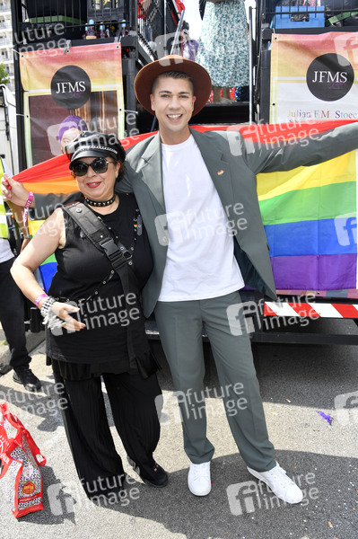 Franziska Traub und Maximillian Seitz auf dem JFMS Truck von Julian F. M. Stoeckel bei der 44. Christopher Street Day Parade 2022 unter dem Motto 'United in Love! Gegen Hass, Krieg und Diskriminierung' vom Spittelmarkt auf gut sieben Kilometern über Potsdamer Platz und Potsdamer Straße zum Nollendorfplatz, von dort weiter zur Siegessäule und zum Brandenburger Tor. Berlin, 23.07.2022