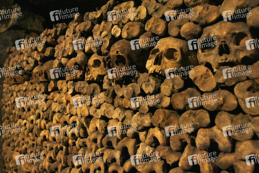 ehemalige unterirdische Steinbrüche unter Paris, ab 1785 unterirdisches Beinhaus, bis zu Beginn des 19. Jahrhunderts waren die Gebeine von etwa 6 Millionen Pariser Bürgern in die Katakomben überführt worden, Knochen, Skelette, Totenschädel