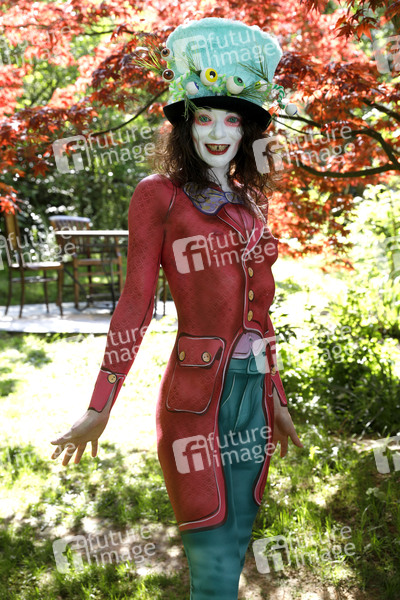 GEEK ART - Bodypainting and Transformaking: Alice im Wunderland Photoshooting mit Julia als verrückter Hutmacher im Czarnecki-Garten. Hameln, 18.05.2023 - Ein Projekt des Fotografen Tschiponnique Skupin und des Bodypainters und Transformakers Enrico Lein