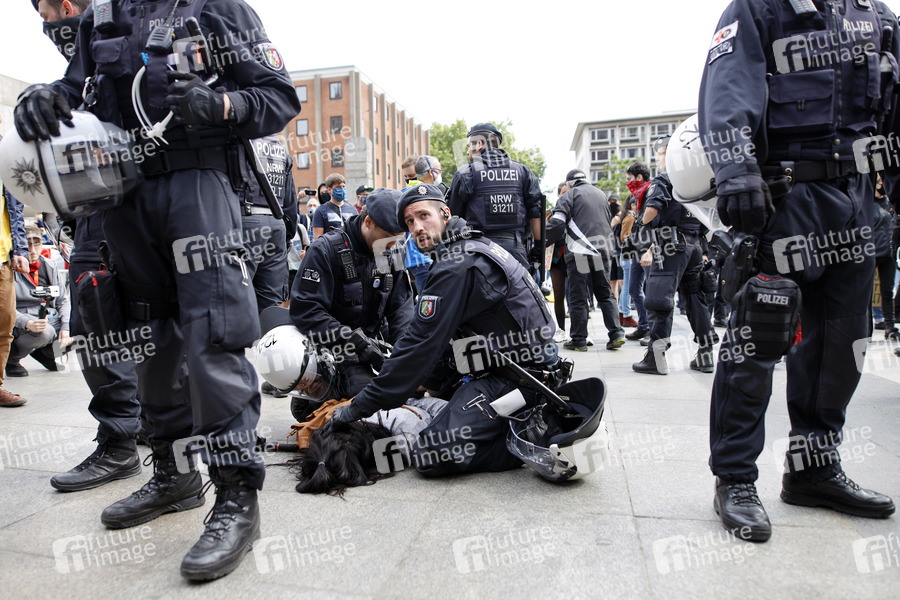 Die Youtuberin Lisa Licentia wird am Rande der Demonstrationen des Bündnis Köln gegen Rechts und Gegner der Corona-Maßnahmen auf dem Roncalliplatz von der Polizei zu Boden gebracht. Köln, 16.05.2020