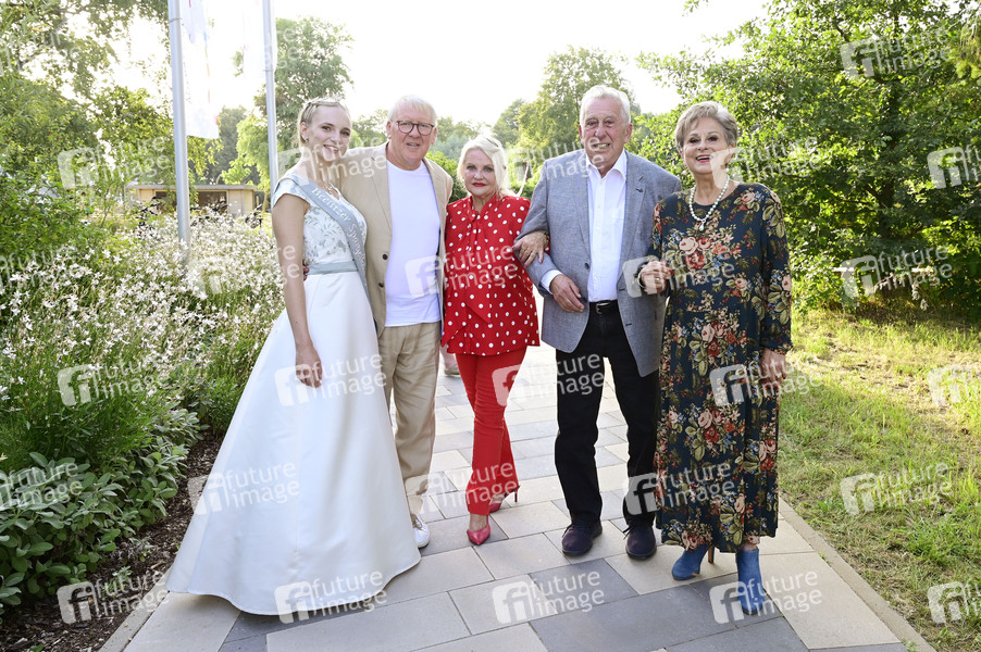 Maxi Hiemann, Bernhard Knuth, Andrea Peetz, Egon Krenz und Dagmar Frederic bei der Premiere des Theaterstücks 'Maxe Baumann - Ferien ohne Ende' während der Beelitzer Festspiele 2025 auf der Freilichtbühne. Beelitz, 14.08.2025