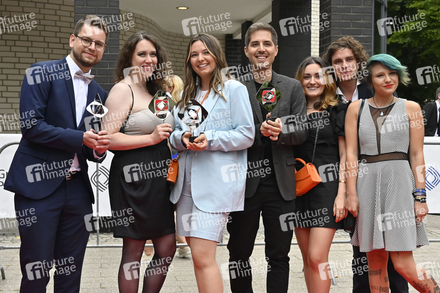 Raphael Gregotsch, Mele und Robert Hecklau mit Team bei der 58. Verleihung des Grimme Preises 2022 im Theater der Stadt Marl. Marl, 26.08.2022