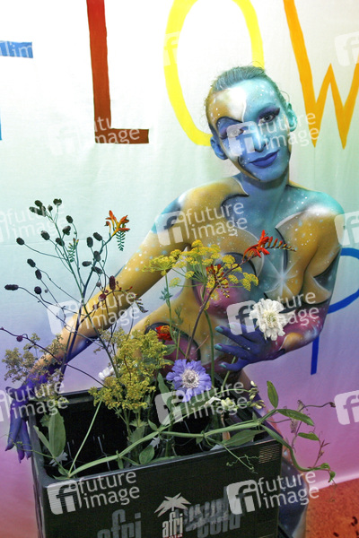 Bodypainting und Fotoshooting mit Model Sarah am Tag der offenen Tür der Meisterschule Justus-von-Liebig-Schule, Abteilung Floristik in Hannover-Ahlem. Künstler: Jörg Düsterwald