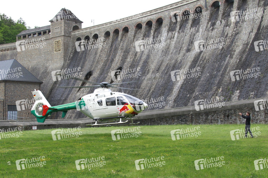 Bei den Dreharbeiten zum Kinofilm 'Schlussmacher' an der Edertalsperre am Edersee. Der Kamera Hubschrauber wird in Position gebracht.