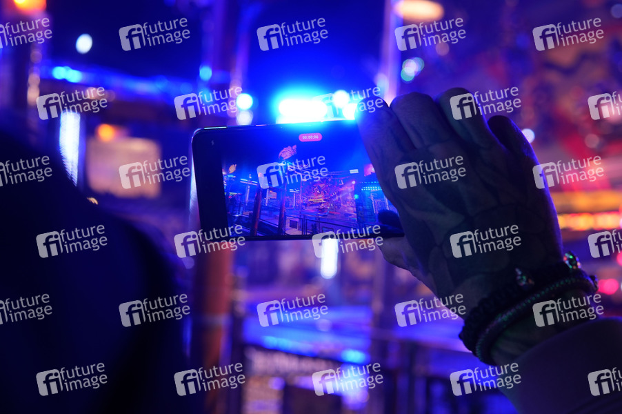 Smartphone-Foto auf dem Weihnachtsmarkt 'Lichtenberger Winterzeit' an der Landsberger Allee im Berliner Bezirk Lichtenberg. Berlin, 03.11.2024