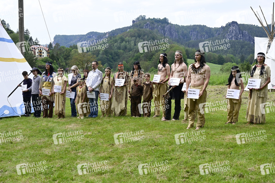 Die Spielgemeinschaft 'Gojko Mitic' Bischofswerda e. V. bei der offiziellen Einweihung einer Sandstein-Stele in der Nähe des Originaldrehortes des Filmes 'Die Söhne der großen Bärin' im Kurort Rathen. Rathen, 19.05.2024