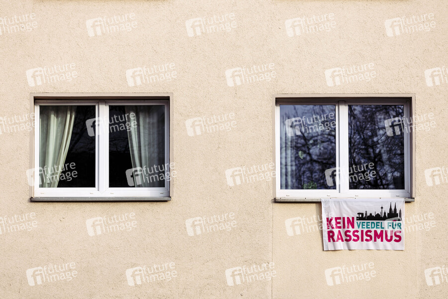 An einem Fenster hängt eine Flagge mit der Aufschrift 'Kein Veedel für Rassismus'. Die Fahnen stammen von einer Kölner Aktivistengruppe, die sich nach eigener Darstellung gegen Hetze, Hass und Ausgrenzung sowie die AfD und Nazis wendet. (Themenbild, Symbolbild) Köln, 21.03.2021