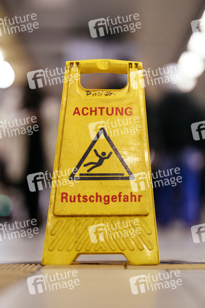 Ein Hinweisschild 'Achtung: Rutschgefahr' warnt Passanten vor einer nassen Stelle in einer U-Bahn-Station. (Themenbild, Symbolbild) Köln, 04.12.2020
