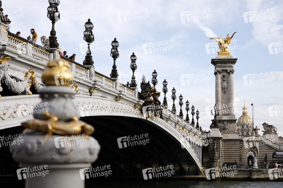 Der Pont Alexandre III ist eine im Stil des Neobarocks errichtete Brücke über die Seine in Paris. Er gilt als eindrucksvollste und auch kühnste Bogenbrücke ihrer Epoche und ist mit zahlreichen dekorativen Elementen wie Löwen, vergoldeten Figuren oder Pylonen versehen. Paris, 29.07.2019