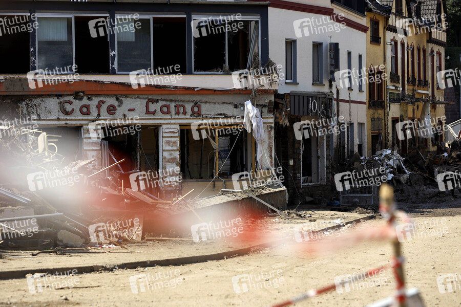 Nach dem Jahrhunderthochwasser in der Eifel durch heftige Regenfälle und Dauerregen mit Überschwemmungen und Überflutungen haben die Aufräumarbeiten im Ahrtal begonnen. Einheiten von Polizei, THW, Bundeswehr und Feuerwehr mitsamt vielen freiwilligen Helfern räumen Straßen, entfernen Schutt und Schlamm und versorgen die Menschen. Im Bild zerstörte Häuser in der Ortschaft Altenahr, in der die Flut viele Häuser zerstörte, 22.07.2021