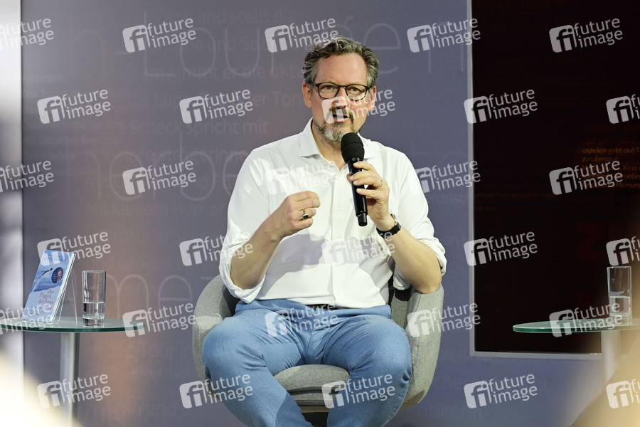 Eckart von Hirschhausen beim Autorengespräch zum Buch 'Der Pinguin, der fliegen lernte' auf der Literaturbühne in der Glashalle auf der Leipziger Buchmesse 2025 auf dem Messegelände. Leipzig, 28.03.2025