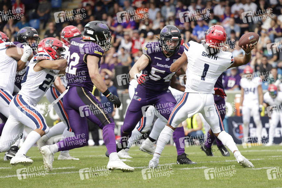Karlis Brauns (Frankfurt Galaxy DL) und Javarian Smith (Hamburg Sea Devils Quarterback) beim American Football-Spiel Frankfurt Galaxy gegen Hamburg Sea Devils in der PSD Bank Arena. Frankfurt am Main, 30.06.2024