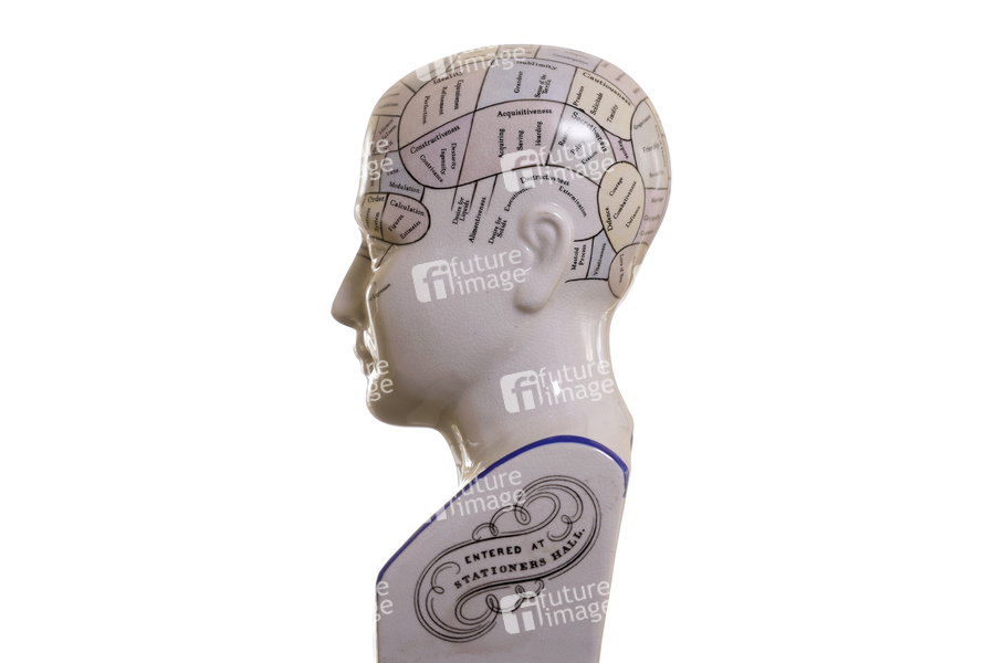 Anatomie, Schädel, Schädellehre, Phrenologie, Phrenology, Büste, Keramik, Kopf, phrenologisch, Physiognomie, Persönlichkeit, Charakter, Geist, Intelligenz, Gemüt, Fähigkeiten, geborene Verbrecher, Homo delinquens, Gehirn, Hirn, Pseudowissenschaft, Physiologie, veraltete Wissenschaften, Wissenschaft, überholte Ansichten, Schädelkunde, Materialismus, Weltbild, Äußeres, äußere Erscheinung, Esoterik, Schädeldeutung, Kopf, Kopfform, Schädelform, Symbolbild, Symbolfoto