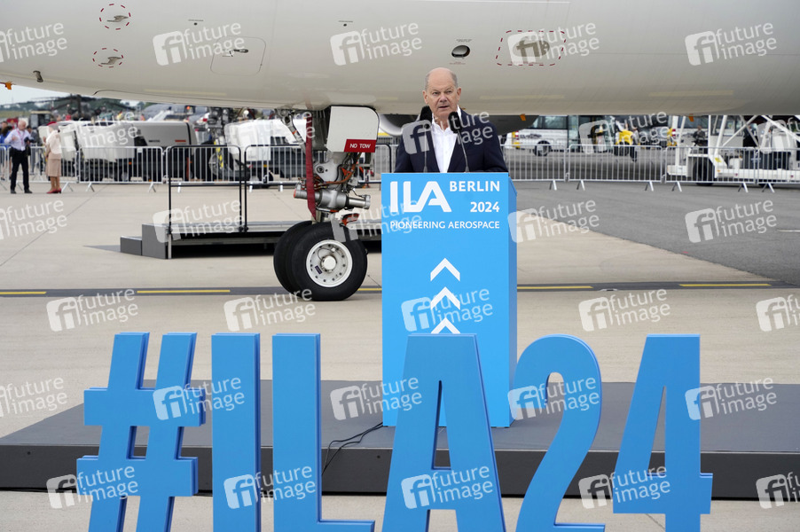 Olaf Scholz vor einem Airbus A321 beim Eröffnungsrundgang der ILA Berlin auf dem ILA-Gelände am Flughafen BER Berlin-Brandenburg. Berlin, 05.06.2024