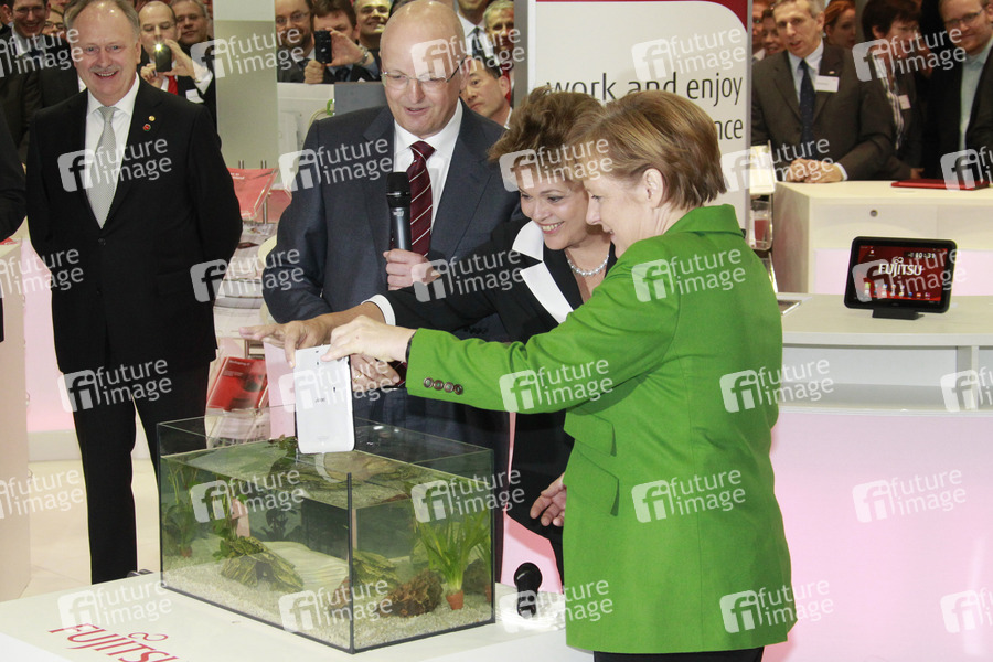 Eröffnungsrundgang von Bundeskanzlerin Merkel auf der CeBIT 2012 (Centrum der Büro- und Informationstechnik), der weltgrößten Messe für Informations- und Computertechnik auf dem Messegelände, Hannover - Am Messestand von Fujitsu versenkt Merkel ein wasserdichtes Tablet