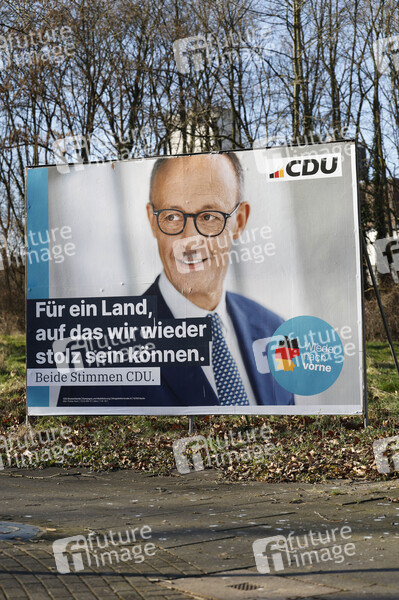 Beeinflussung der Wählerin, Botschaft, Bundestagswahl, Bundestagswahlen, Bundestagswahlkampf, Eigenwerbung, Großflächenplakat, Kampagne, Kandidat, Kandidaten, Kandidierende, Logo, Partei, Partei-Symbol, Parteien, Parteienwerbung, Parteilogo, Plakat, Plakatkampagne, Plakatständer, Politik, Politiker, Politikerinnen, Protestwähler, Slogan, Stammwähler, Wahl, Wahlbeeinflussung, Wahlbeteiligung, Wählen, Wählerschicht, Wählerschichten, Wahlkampagne, Wahlkampf, Wahlkampfmodus, Wahlkandidat, Wahlprogramm, Wahltermin, Wahlwerbung, Wirkung, Wirkungsmacht, Strafen, Eigentum der jeweiligen Partei, Beschädigen, Beschädigung, Geldstrafe, Schadensersatz, Sachbeschädigung, Wahl-Plakate, CDU, Christlich Demokratische Union Deutschlands, Friedrich Merz, Symbolbild, Symbolfoto, Themenbild, Themenfoto