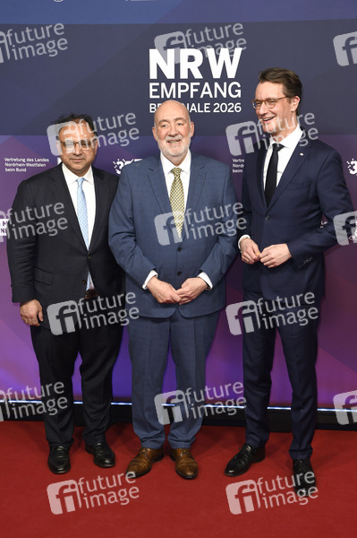 Walid Nakschbandi, Ron Prosor und Hendrik Wüst beim 23. NRW Empfang des Landes NRW und der Film- und Medienstiftung NRW im Rahmen der Berlinale 2026 in der Vertretung des Landes Nordrhein-Westfalen. Berlin, 15.02.2026