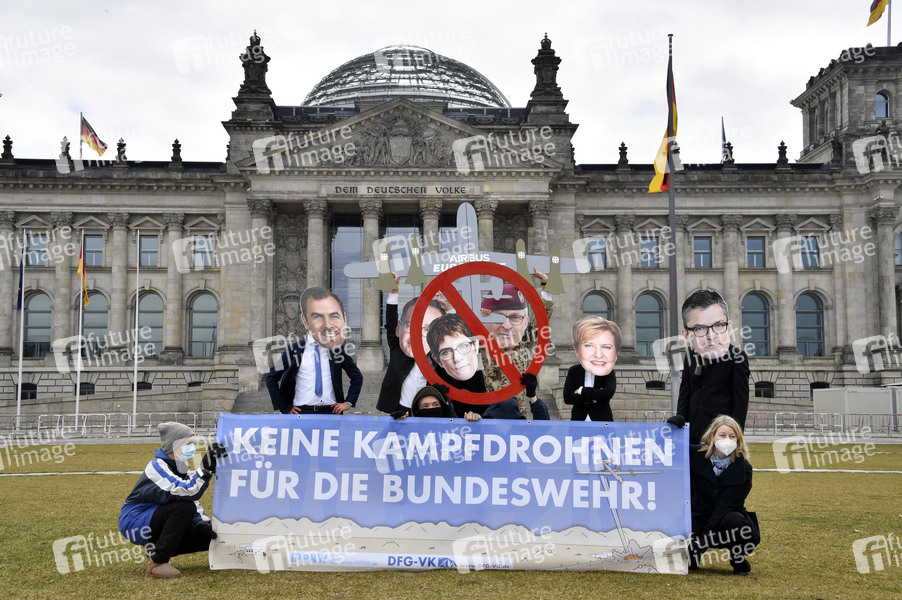 Aktivisten mit Masken von Drohnen-Befürwortern und der 'Eurodrohne' bei der Fotoaktion 'Keine Kampfdrohnen für die Bundeswehr!' vor dem Bundestagsgebäude. Berlin, 18.03.2021