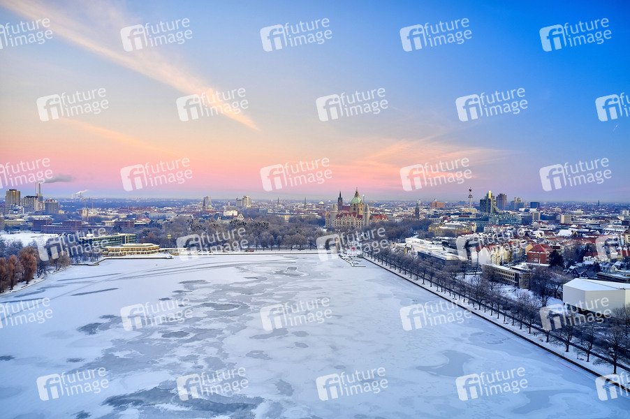 Luftbild vom zugefrorenen Maschsee bei Sonnenaufgang im Winter. (Der Drohnenflug wurde ordnungsgemäß bei der Polizei Leitstelle Hannover angemeldet) Hannover, 14.02.2021