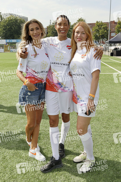 Yasmina Filali, Annabelle Mandeng und Esther Roling beim Benefiz-Fußballspiel 'Kicken mit Herz' 2024 zu Gunsten des Herzzentrums des UKE im Stadion des SC Victoria. Hamburg, 08.09.2024