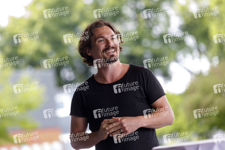Dominik Schönenborn von Cat Ballou bei der Pressekonferenz zum Neustart der Open Air Konzert Saison nach den aktuellen Corona-Vorgaben im Kölner Tanzbrunnen. Köln, 17.06.2020