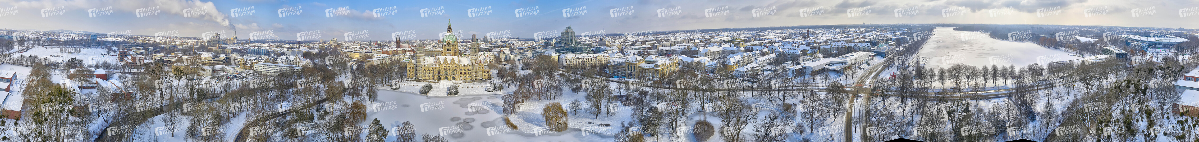 Luftbild vom verschneiten Maschpark mit dem Neuen Rathaus im Winter. (Der Drohnenflug wurde ordnungsgemäß bei der Polizei Leitstelle Hannover angemeldet) Hannover, 09.02.2021