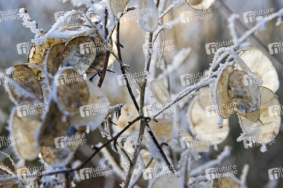 Samen eines Silberlings mit Rauhreif überzogen, Lunária rediviva
