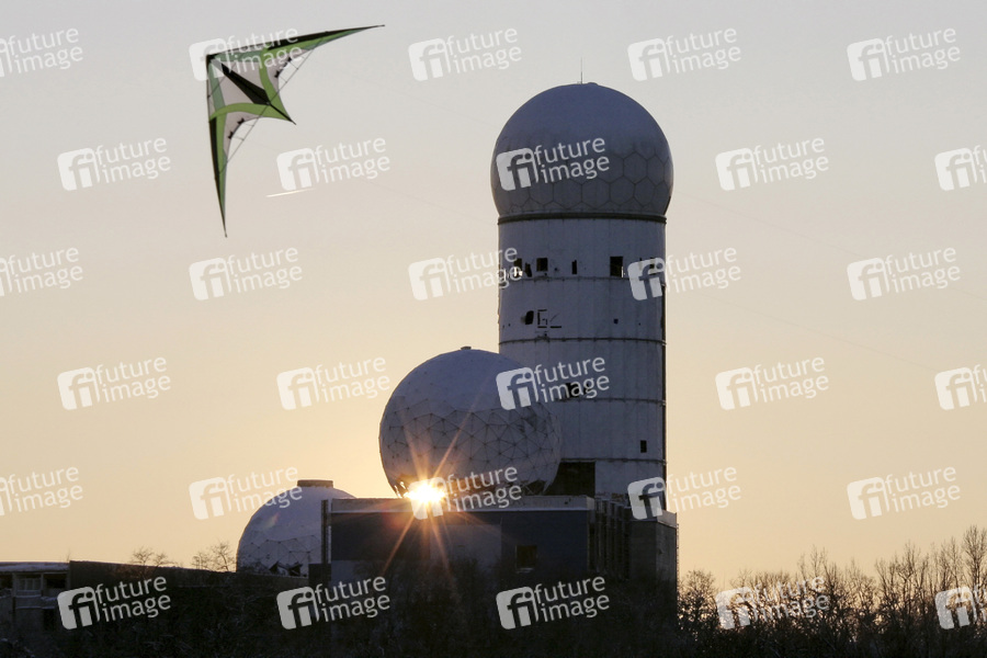 Untergehende Sonne mit Drachen vor der Radarstation auf dem Teufelsberg. Berlin, 05.01.2009