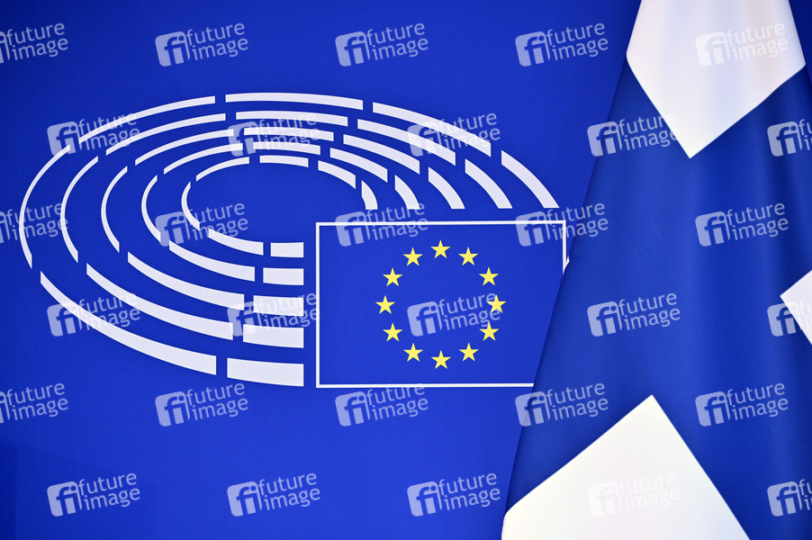 Die Nationalflagge Finnlands beim Fototermin im Europäischen Parlament. Straßburg, 13.09.2022