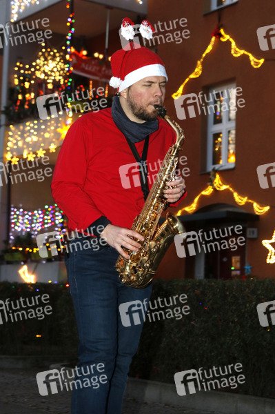 Kiez, Nachbarschaft, Musik Straßenmusik, Saxophon, Weihnachtslieder, Weihnachtsmusik, Weihnacht, Weihnachten, Weihnachtsatmosphäre, Weihnachtsbeleuchtung, Weihnachtsdeko, eihnachtsfest, Weihnachtslichter, Weihnachtsmann, Weihnachtsschmuck, Weihnachtsstimmung, Weihnachtszeit, Winter, Winterzeit, Xmas, X-Mas, zweite Welle, Advent, Symbolbild, Symbolfoto, Social distancing, Saxofonist, Saxofon, Musiker
