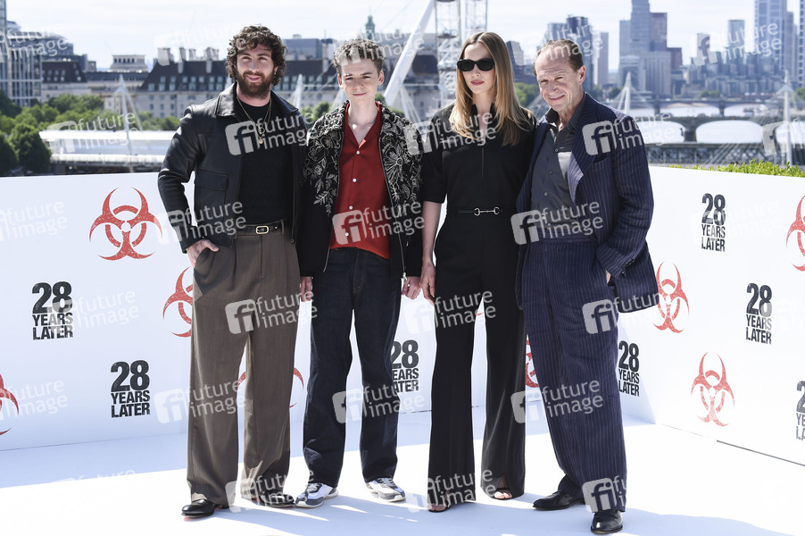Aaron Taylor-Johnson, Alfie Williams, Jodie Comer und Ralph Fiennes beim Photocall zum Kinofilm '28 Years Later' auf der Dachterasse des IET London Savoy Place. London, 16.06.2025