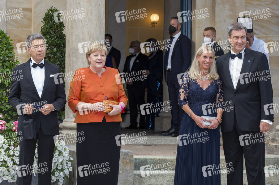 Angela Merkel mit Ehemann Joachim Sauer und Markus Söder mit Ehefrau Karin Baumüller bei der Eröffnung der Richard-Wagner-Festspiele 2021 mit der Premiere von Richard Wagners 'Der fliegende Holländer' im Bayreuther Festspielhaus. Bayreuth, 25.07.2021