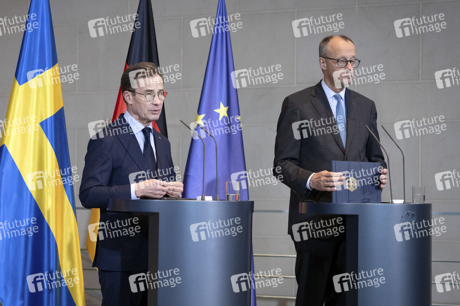 Ulf Kristersson und Friedrich Merz bei der Pressekonferenz nach der Unterzeichnung der bilateralen deutsch-schwedischen Innovationspartnerschaft im Bundeskanzleramt. Berlin, 19.11.2025