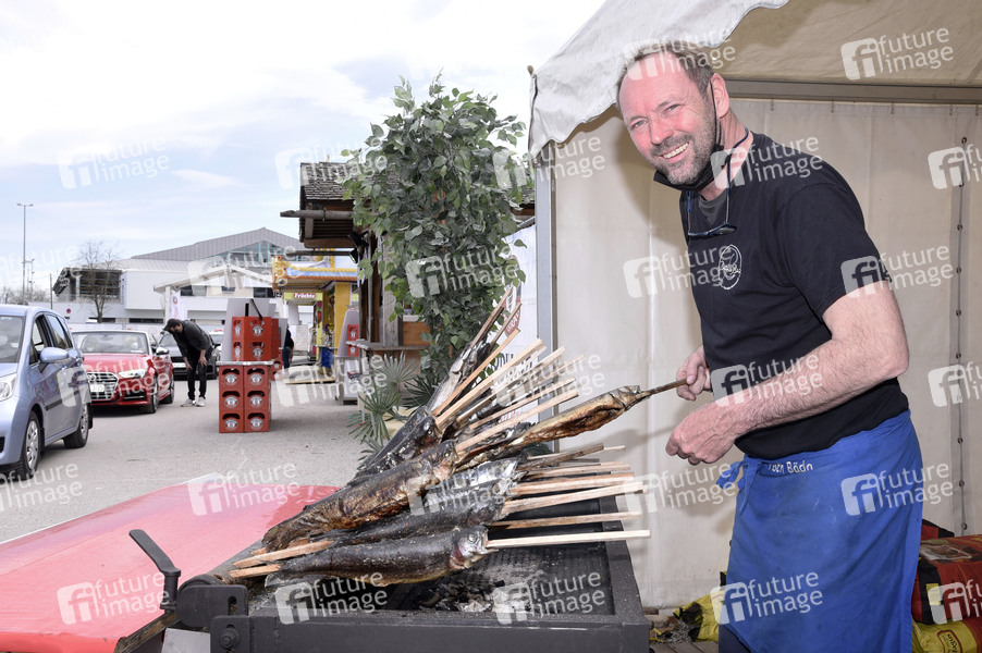 Peter Lingnau (Fisch-Bäda Wiesnstadl) beim Frühlings Drive In auf dem Volksfestplatz. Sowohl die Stadt Erding als auch das Landratsamt haben Das Frühlingsfest To Go genehmigt, die Veranstalter haben ein sicheres Hygienekonzept vorgelegt. Der Frühlings Drive In hat vom 9. April bis einschließlich 18. April 2021 täglich in der Zeit von 11-20 Uhr geöffnet. Insgesamt gibt es sechs Buden. Die Besucher können mit dem Pkw, LKW, Mofa oder Motorrad durchfahren und sich alle Volksfest Leckereien zum mitnehmen bestellen. Das Befahren des Geländes ist derzeit alleine, zu zweit oder mit Personen aus zwei verschiedenen Haushalten zulässig. (Quelle: charivari.de) Erding, 11.04.2021
