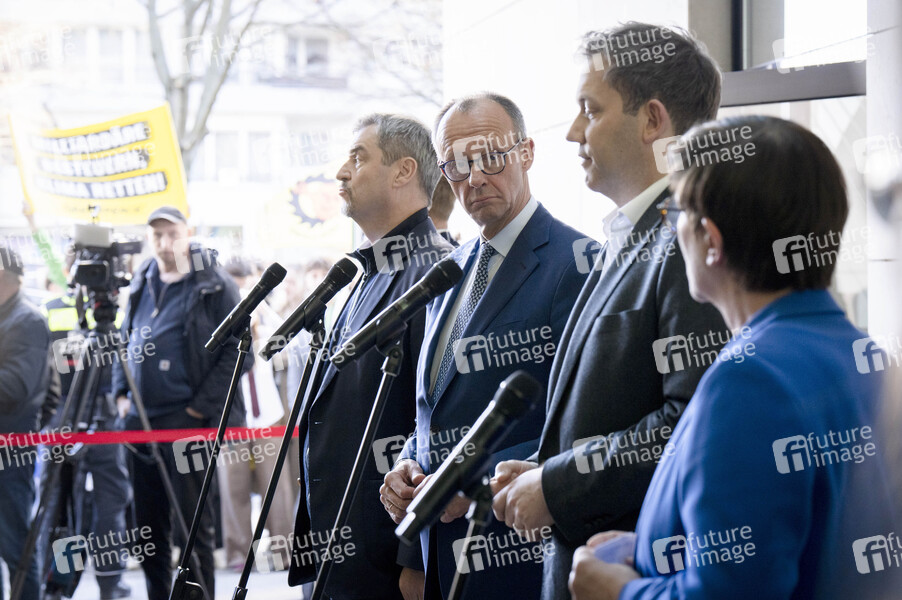 Markus Söder, Friedrich Merz, Lars Klingbeil und Saskia Esken beim gemeinsamen Auftaktstatement der Parteivorsitzenden von CDU, CSU und SPD zur Bildung einer neuen Regierungskoalition im Willy-Brandt-Haus. Berlin, 28.03.2025