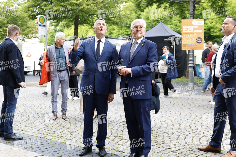 Frank-Walter Steinmeier mit Bürgermeister Manfred Wilde auf dem Weg durch die Stadt Delitzsch zum Rathaus. Steinmeier verlegt seinen Amtssitz für drei Tage nach Sachsen. Der Besuch im Landkreis Nordsachsen ist Teil der Reihe 'Ortszeit Deutschland', bei der das Staatsoberhaupt regelmäßig in verschiedene Regionen reist, um mit Bürgerinnen und Bürgern ins Gespräch zu kommen und die Entwicklung vor Ort kennenzulernen. Delitzsch, 20.05.2025