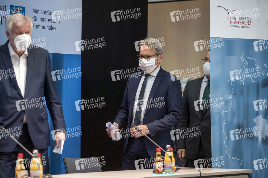 Politiker, CSU, Bundesminister des Innern, SPD, Innenminister von Thüringen, Politik, IMK, Ständige Konferenz der Innenminister und der Länder, interföderales Abstimmungsgremium, Treffen, Versammlung, PK, Corona, Coronamaßnahmen, Corona-Schutzmaßnahmen, Atemschutz, Atemschutzmaske, Virenschutz, Schutzmaske, Maske, Mundschutz, Mund-Schutz, Mundschutzpflicht, Maskenpflicht, Mundschutz-Pflicht, Mund-Nase-Schutz, Mund-Nasen-Schutz, MNS