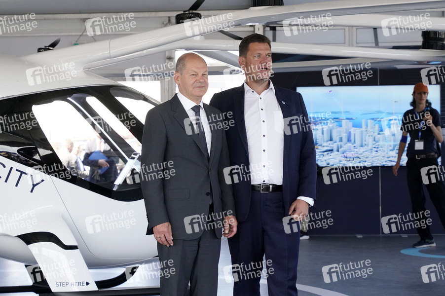 Olaf Scholz mit Stefan Klocke vor einem elektrischen Lufttaxi Volocity von Volocopter bei der ILA-Eröffnung mit anschließendem Rundgang auf dem ILA-Gelände am Flughafen BER Berlin-Brandenburg. Berlin, 22.06.2022