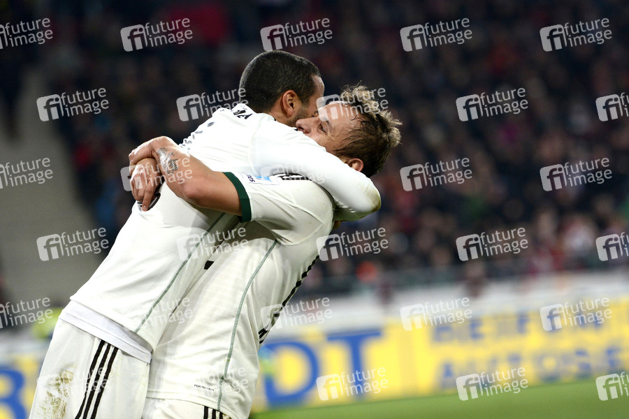 Thiago Alcantara und Rafinha beim Fußball Bundesliga Spiel Hannover 96 gegen FC Bayern München (0:4) in der HDI Arena. Hannover, 23.04.2014