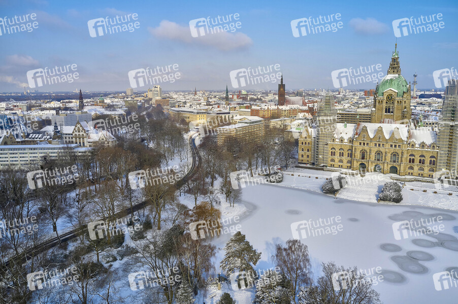 Luftbild vom verschneiten Maschpark mit dem Neuen Rathaus im Winter. (Der Drohnenflug wurde ordnungsgemäß bei der Polizei Leitstelle Hannover angemeldet) Hannover, 09.02.2021
