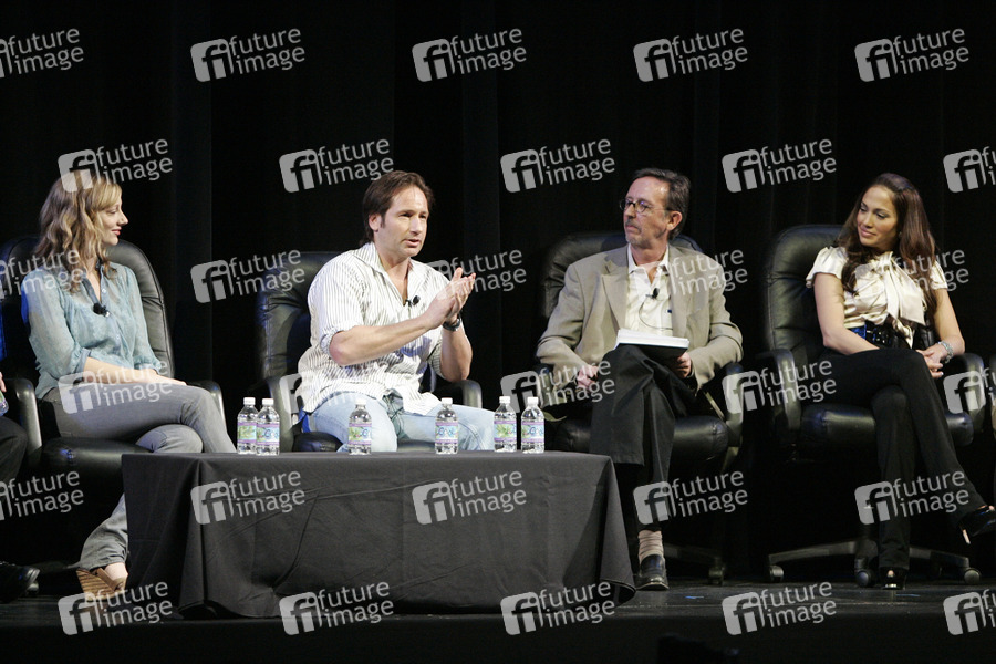 Judy Greer, David Duchovny, Gregg Kilday und Jennifer Lopez bei einer Independent Film Podiumsdiskussion auf der ShoWest 2007 im Paris Hotel. Las Vegas, 14.03.2007