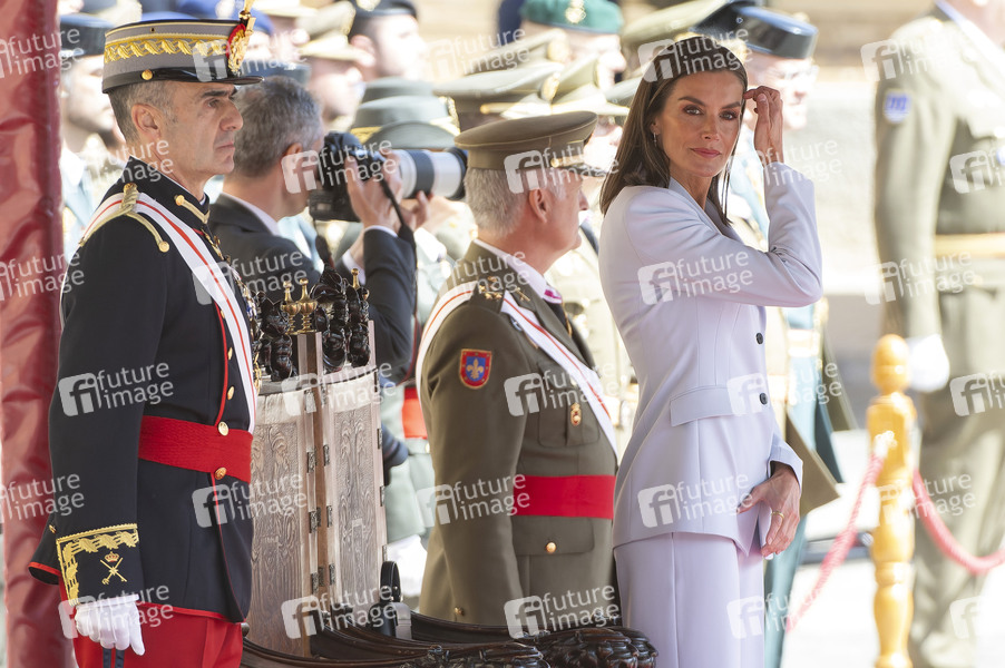 Ausbildung, General Military Academy, Militärakademie, Zaragoza, Militär, Soldaten, Kadetten, Soldatin, Kadettin, Zeremonie, Tradition, Treuebekundung, Fahneneid, Gelöbnis, Vereidigung, Adel, König von Spanien, Staatsoberhaupt, Fürst von Asturien, Fürst von Girona, Felipe de Borbón, Monarch, Dynastie Bourbon-Anjou, Königin von Spanien, Letizia Ortiz Rocasolano, Fürstin von Asturien, Royals