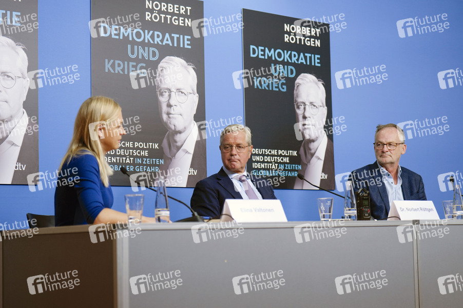 Elina Valtonen, Norbert Röttgen und Frank Plasberg bei der Präsentation des Buches 'Nie wieder hilflos!' von Norbert Röttgen im Haus der Bundespressekonferenz. Berlin, 24.09.2024